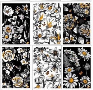 Kolekce poznámkových sešitů s kresbami na obálce.
