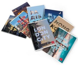 Sešit se šitou vazbou velikosti A4 s motivem světových velkoměst. Štítek s informacemi jako je předmět, jméno a příjmení, škola, adresa a další se nachází na prvním vnitřním listu.
