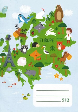 Sešit velikosti A5 s motivem. Vlastnosti: štítek pro informace (jako je předmět, jméno a příjmení, škola..) se nachází na prvním listu, 40 čtverečkovaných listů.