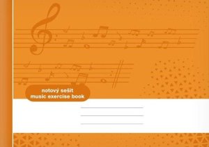 Školní notový sešit ve formátu A5 na šířku, v oranžové barvě, v deskách z křídového papíru.