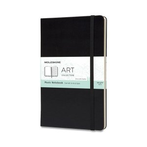Zápisník v klasickém designu Moleskine pro notový zápis obsahuje notovou osnovu na obou stranách zápisníku.