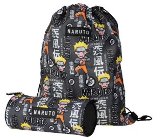 Atraktivní set vaku s barelovým penálem na tužky vyvedených s grafikou postav a nápisů Naruto.
