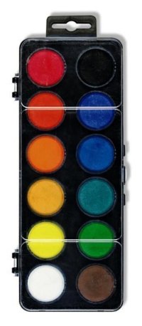 Školní vodové barvy 12ti odstínů s tabletami o průměru 3 cm v obdélníkových, plastových, jednopatrových barevnících s transparentním víčkem.