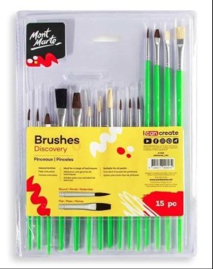 Sada 15 štětců různých tvarů a velikostí z přírodních materiálů.