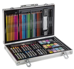 Umělecký kufřík kovový naplněný – obsahuje 79 ks různých potřeb pro malíře ( vodové barvy, pastelky, štětce, gumu, ořezávátko atp.)