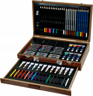 Malířský kufřík dřevěný představuje komplexní kreativní sadu, která obsahuje celkem 150 kusů výtvarných potřeb.
