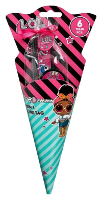 Školní kornout s motivem LOL. Kornout obsahuje 6 dárků: tužku, pravítko, ořezávátko a 3x gumy.