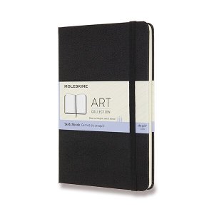 Zápisník vhodný na kresby, skici i malby, s pevnou, ve hřbetu šitou vazbou v kartonových deskách, obepnutý pružnou páskou proti samovolnému otevírání.