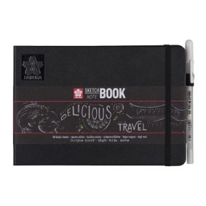Skicák/zápisník Sakura o rozměrech 21 x 14,8 cm (A5) s 80 černými listy bezkyselinového papíru 140 g/m2 uchovává všechny vaše výtvory vytvořené tuší, tužkou, olejovým pastelem nebo uhlím na jednom …