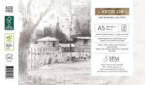 Skicář vhodný na kresby, skici i malby, s pevnou, ve hřbetu šitou vazbou v kartonových deskách, obepnutý pružnou páskou proti samovolnému otevírání.