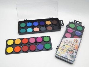 Školní vodové barvy 24 odstínů s tabletami o průměru 30 mm v obdélníkových, dvoupatrových, plastových barevnících s papírovou vložkou.