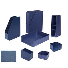 • Kompaktní stolní kancelářská sada vyrobená z recyklovaných materiálů zahrnuje 7 ks vybavení v modré barvě: stojan na katalogy (32,5 x 25 x 8 cm), zásobník na bločky (11,8 x 10,5 x 6,5 cm), stojánek na psací potřeby (12,5 x 6,5 x 11,2 cm), zásobník na dokumenty (31,5 x 24 x 7 cm), dva organizéry - na kancelářské potřeby (12,5 x 10,5 x 6,5 cm), a organizér na psací potřeby (23 x 6,4 x 10,6 cm) s vyjímatelnou mřížkou, po vyndání lze použít jako samostatný organizér