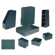 • Kompaktní stolní kancelářská sada vyrobená z recyklovaných materiálů zahrnuje 7 ks vybavení v zelené barvě: stojan na katalogy (32,5 x 25 x 8 cm), zásobník na bločky (11,8 x 10,5 x 6,5 cm), stojánek na psací potřeby (12,5 x 6,5 x 11,2 cm), zásobník na dokumenty (31,5 x 24 x 7 cm), dva organizéry - na kancelářské potřeby (12,5 x 10,5 x 6,5 cm), a organizér na psací potřeby (23 x 6,4 x 10,6 cm) s vyjímatelnou mřížkou, po vyndání lze použít jako samostatný organizér