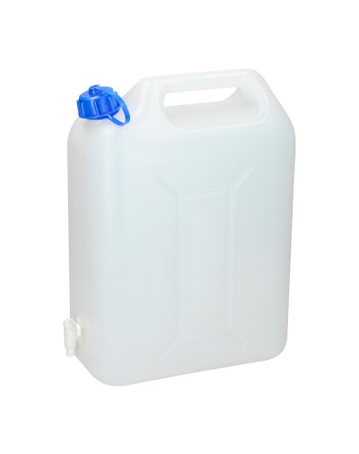 Kanystr HDPE určený k uchování pitné vody. Se spodním výpustným kohoutem, uzávěr s gumovým těsněním.