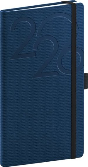 Kapesní diář Ajax 2026 v modré barvě. Jemně strukturovaný povrch s atypickým reliéfem je vhodný pro všechny typy ražeb. Diář má zakulacené rohy, poutko na tužku a elastickou gumičku. Týdenní rozvrh s česko-slovenským kalendáriem a doplňkovou angličtinou, němčinou, maďarštinou a ruštinou.