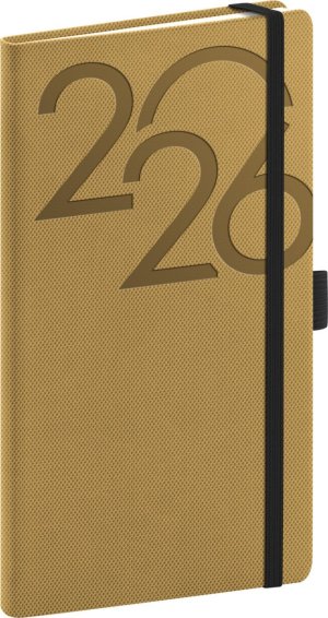 Kapesní diář Ajax 2026 ve zlaté barvě. Jemně strukturovaný povrch s atypickým reliéfem je vhodný pro všechny typy ražeb. Diář má zakulacené rohy, poutko na tužku a elastickou gumičku. Týdenní rozvrh s česko-slovenským kalendáriem a doplňkovou angličtinou, němčinou, maďarštinou a ruštinou.