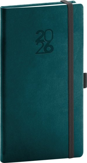 Kapesní diář Aprint Top 2026 v petrolejové barvě. Rozšíření oblíbené řady Aprint o variantu s gumičkou na zavírání a poutkem na tužku. I zde je možnost ražby letopočtu a loga. Týdenní rozvrh s česko-slovenským kalendáriem a doplňkovou angličtinou, němčinou, maďarštinou a ruštinou.