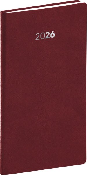Plánovací kapesní diář Balakon 2026 v provedení bordó, doplněný o stříbrný letopočet. Povrch diáře si získal oblibu díky kvalitnímu svrchnímu materiálu, který je extrémně odolný vůči vnějšímu poškození. Týdenní rozvrh s česko-slovenským kalendáriem a doplňkovou angličtinou, němčinou, maďarštinou a ruštinou.