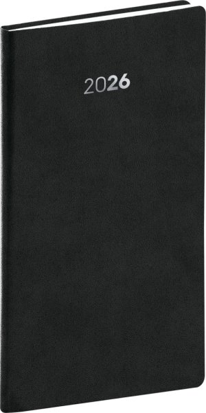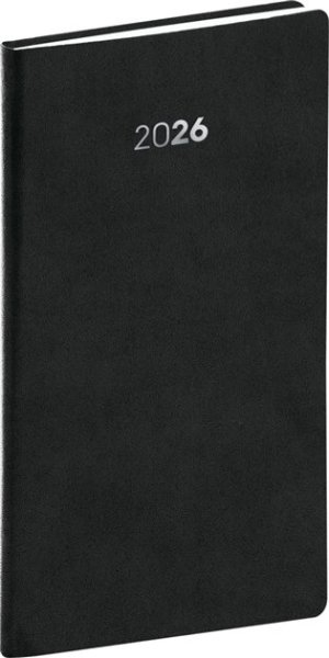 Plánovací kapesní diář Balakon 2026 v černém provedení, doplněný o stříbrný letopočet. Povrch diáře si získal oblibu díky kvalitnímu svrchnímu materiálu, který je extrémně odolný vůči vnějšímu poškození. Týdenní rozvrh s česko-slovenským kalendáriem a doplňkovou angličtinou, němčinou, maďarštinou a ruštinou.