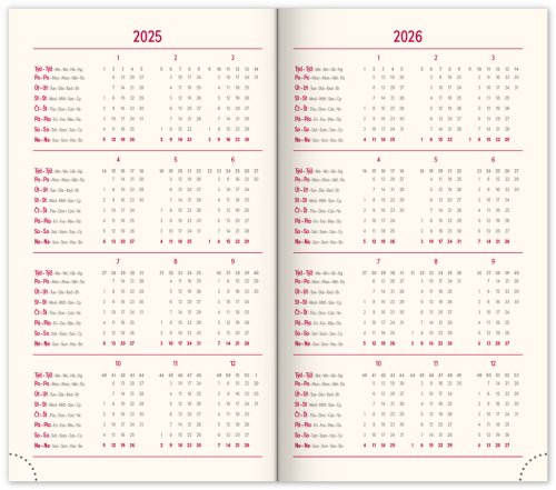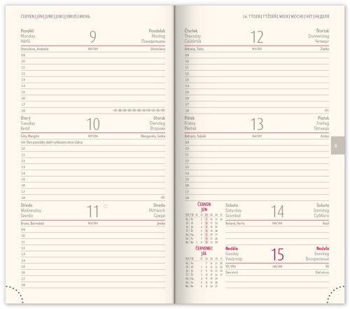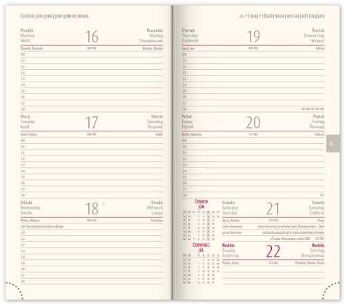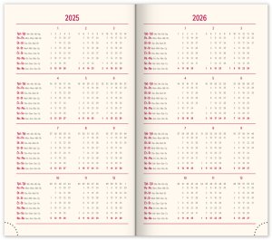 Kapesní diář Diamante 2025 v růžové barvě. I zde je možnost ražby letopočtu a loga. Týdenní rozvrh s česko-slovenským kalendáriem a doplňkovou angličtinou, němčinou, maďarštinou a ruštinou.