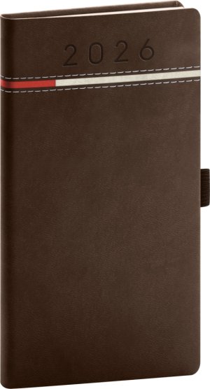Kapesní diář Tomy 2026 v hnědo-červené barvě. Klasický povrch imitující kůži, který doplňuje jemné prošití. Na materiál lze tisknout a je vhodný pro všechny typy ražeb. Týdenní rozvrh s česko-slovenským kalendáriem a doplňkovou angličtinou, němčinou, maďarštinou a ruštinou.