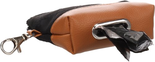 Kapsička Flamingo Cellie na sáčky na psí exkrementy je vyrobena z polyesteru a umělé kůže. Kapsa má otvor na vytahování pytlíků, uzavírání na zip a karabinu, za kterou ji lze připnout např. na vodítko, batoh nebo poutko u kalhot. Obsahuje 1 roli 20 sáčků o rozměrech 22 × 32 cm. Rozměry (cca): A = 10,5 cm, B = 3,5 cm, C = 8 cm (viz obrázek) Materiál: polyester, umělá kůže Barva: černá, hnědá