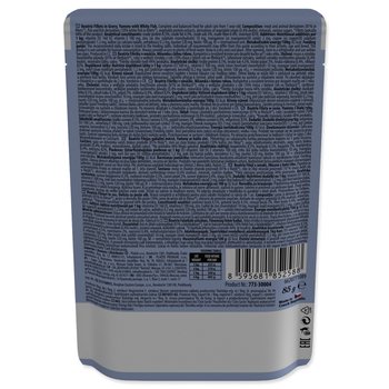 | Složení: | Maso a výrobky živočišného původu (81 % ve filetkách*), ryby a vedlejší výrobky z ryb (10 % maso z bílých ryb ve filetkách*), bílkovinné extrakty, vedlejší výrobky rostlinného původu (0,4 % inulin), minerální látky, cukry. *Filetky obvykle tvoří 44 % produktu. |