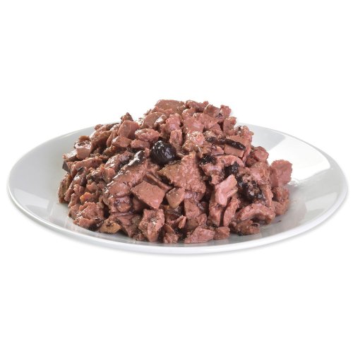 Složení: 45 % maso a vedlejší výrobky živočišného původu ve filetech (4 % kuře), 35 % ryby a výrobky rybího původu ve filetech (4 % tuňák), 9,6 % masová šťáva, 1,5 % byliny a ovoce (hřebíček, citrusy, rozmarýn, kurkuma), 0,5 % borůvky, 1 % minerály, 1 % lososový olej, 0,5 % mannan-oligosacharidy, 0,5 % frukto-oligosacharidy, 0,4 % inulin. Analytické složky: hrubý protein 8 %, hrubé oleje a tuky 4 %, hrubý popel 2 %, hrubá vláknina 0,4 %, vlhkost 82 %, vápník 0,3 %, fosfor 0,2 %, sodík 0,5 %. Nutriční doplňkové látky na 1 kg: vitamín D3 (E671) 250 m.j., vitamín E (3a700) 100 mg, zinek (3b606) 15 mg, železo (3b103) 10 mg, mangan (3b502) 3 mg, jód (3b201) 0,75 mg, měď (E4) 0,5 mg, biotin (3a880) 0,2 mg. Bez umělých aromat. Bez konzervantů. Metabolizovatelná energie: 820 kcal/kg Krmný návod: