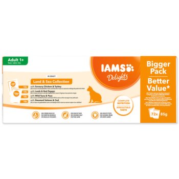 Pevninská a mořská kolekce IAMS Delights ve vlastní šťávě je 100% kompletní a vyvážené prvotřídní mokré krmivo pro dospělé kočky v praktickém balení multipack.