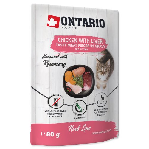 Doplňkové krmivo pro koťata od 1 měsíce – lahodné kousky kuřecího masa s játry a sladkými bramborami v chutné omáčce. Speciálně ochuceno rozmarýnem.