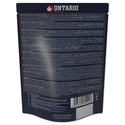 Krůtí maso 40%, kuřecí maso 30%, vývar 18%, brambory 4%, hrách 3%, mrkev 3%, změkčené kuřecí kosti 2%.