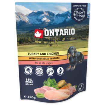 Krůtí a kuřecí maso se zeleninou ve vývaru. Kompletní krmivo pro psy všech věkových skupin (od 2. měsíce věku) inspirováno Barfem.