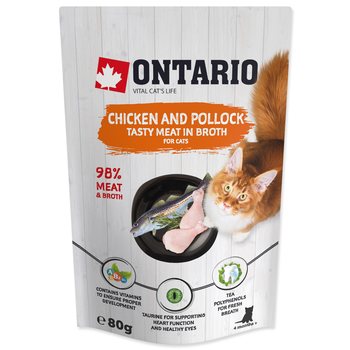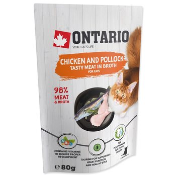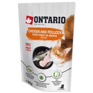 Doplňkové krmivo pro kočky s kuřecím masem a treskou polak ve vývaru.