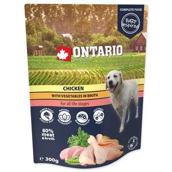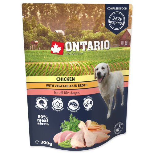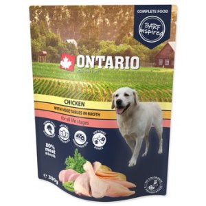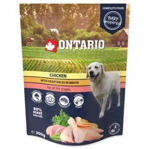 Kuřecí maso se zeleninou ve vývaru. Monoproteinové, kompletní krmivo pro psy všech věkových skupin (od 2. měsíce věku) inspirováno Barfem.