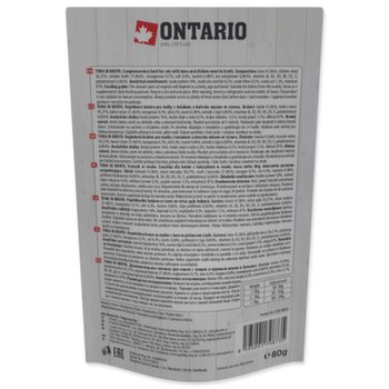 Složení: maso a výrobky živočišného původu, ryby a výrobky z ryb 71,33% (tuňák 41,06%, kuřecí maso 30,27%), kuřecí vývar 27,482%, karagenan 0,7%, sůl 0,4%, taurin 0,08%, extrakt z čaje 0,005%, vitaminy (A, B2, B3, B5, D3, E, polydextróza) 0,003%.