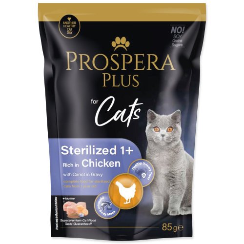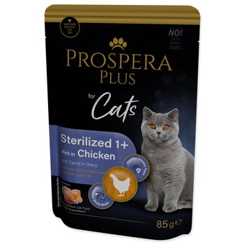 Kompletní a vyvážené krmivo pro kastrované kočky od 1 roku v podobě kapsičky s kuřecím a mrkví v omáčce.