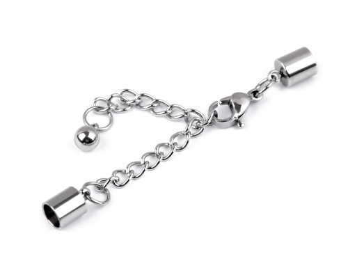 Kompletní ukončovací sada z nerezové oceli se hodí na zapnutí šperků jako jsou náhrdelníky nebo náramky. Materiál, který vložíte do kaplíků je nutné vlepit. Karabinka bez očka měří 6 x 8 mm, s očkem 6 x 11 mm. Koncovky mají vnitřní Ø5 mm, hloubku 5,5 mm, prodlužovací řetízek je dlouhý cca 50 mm.