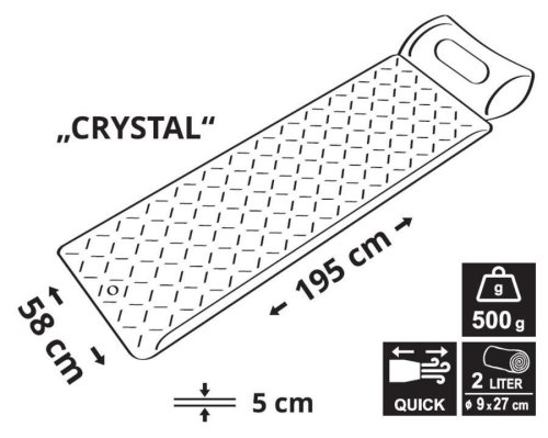 Chystáte se stanovat? Nezapomeňte s sebou přibalit karimatku a připravte si pohodlné místo na spaní. Nafukovací karimatka Cattara CRYSTAL s polštářkem vám poskytne komfort nejen při odpočinku v přírodě. Při nafukování membrána zadrží vzduch uvnitř karimatky, což usnadňuje její přípravu. Nafouknutá karimatka má rozměry 195 x 58 x 5 cm.