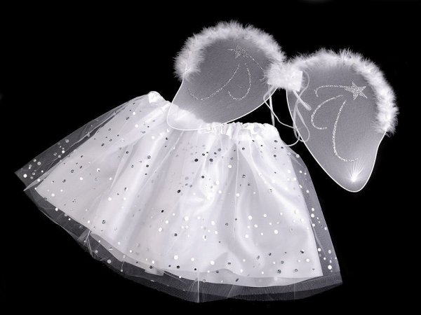 S karnevalovou sadou proměníte svou malou holčičku v anděla. Kostým anděla se skládá z tylové sukýnky a křídel, která jsou vyztužená a nasazují se pomocí gumiček. Rozměry křídel jsou 32 x 43 cm, délka sukně je 32 cm, obvod pasu je 48 - 80 cm.