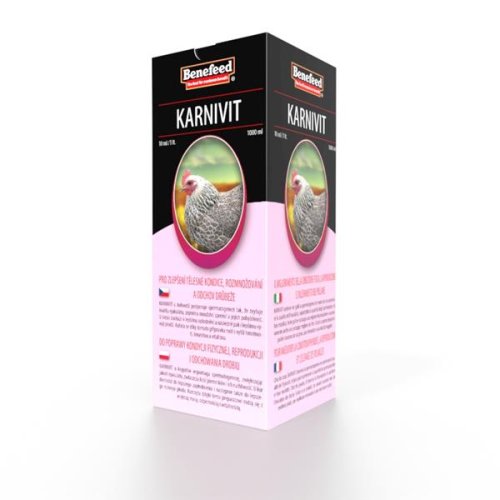 Pro zlepšení reprodukce a odchovu kuřat KARNIVIT obsahuje specifický komplex látek zlepšujících reprodukci drůbeže ve Vašem chovu. Všechny aktivní látky jsou ve formě, která zajistí maximální účinnost každé z nich. KARNIVIT u kohoutů podporuje spermatogenezi, protože zvyšuje kvalitu ejakulátu, zejména množství spermií a jejich pohyblivost. U slepic dochází k lepšímu oplodnění a následně pak i lepšímu vývoji plodů. Kuřata se díky KARNIVITu rodí s vyšší hmotností, imunitou a vitalitou, což se pozitivně projevuje na jejich zdravotním stavu a vývoji v dalším období jejich života. KARNIVIT je vhodné podávat mladým kuřátkám již po vylíhnutí, udržuje se tak jejich vyšší vitalita a imunita, což se projevuje na jejich menší úmrtnosti. KARNIVIT je možno také použít v případech, kdy je žádoucí zlepšit nárůst kosterního svalstva, jako je tomu např. v případě užitkových ptáků nebo ptáků pro výstavní nebo sportovní účely. Vysoká účinnost přípravku je dána speciální technologií výroby, kdy jsou aktivní látky obdukcí chráněny před degradací v žaludku a zažívacím traktu. Tento ochranný obal je postupně odbouráván až dojde k úplnému uvolnění aktivní látky v organismu v její maximální účinnosti. Významným přínosem této technologie je skutečnost, že je v roztoku vytvořena speciální nosná a izolační houbovitá mikrostruktura, která zamezuje ulpívání aktivních látek na stěnách rozvodu napájecí vody nebo v napáječkách. Tím se eliminuje hrozba namnožení nežádoucích organismů na těchto zbytcích a jejich následné roznášení všem zvířatům. Složení: L-karnitin vitamíny přírodní látky upravená pitná voda
