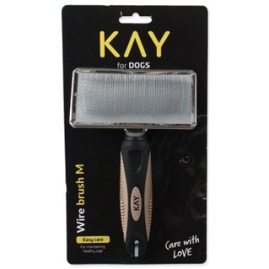 Jednostranný kartáč pro střední psy s příjemně tvarovanou plastovou rukojetí a jemnými drátěnými štětinami.
