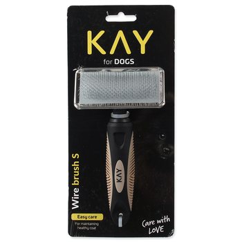 Jednostranný kartáč pro malé psy s příjemně tvarovanou plastovou rukojetí a jemnými drátěnými štětinami.