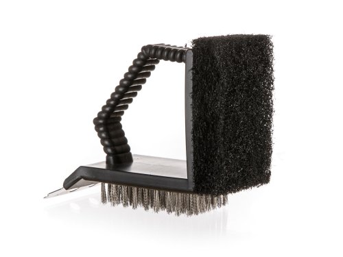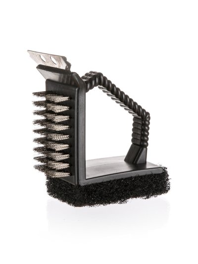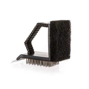 Plastový čisticí kartáč 3 v 1 je určený na údržbu a čistění grilu a grilovací mřížky. Kartáč je praktický pomocník při úklidu grilu po grilování. Obsahuje škrabku pro odstranění hrubých nečistot z grilovací desky, kovový kartáč na očištění hrubých nečistot z grilovací mřížky a houbovitou stěrku na dočištění urdžovaných ploch.