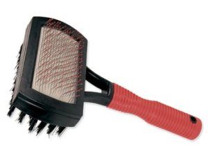 Oboustranný kartáč s gumovou rukojetí, kovovými drátky a nylonem na vyčesávání línajících chlupů.