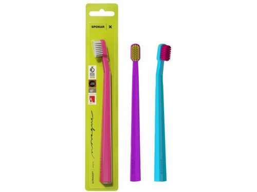 Prémiová řada zubních kartáčků Spokar X je navržena na základě aktuálních doporučení stomatologických odborníků, jedinečný design je výsledkem hledání optimálního držení kartáčku s cílem snadné manipulace a perfektního vyčištění zubů. Hlava kartáčku je velmi hustě osazena vysoce kvalitními jemnými vlákny se zaoblenými konci, tato vlákna účinně odstraňují zubní plak a jsou šetrná k dásním. Supersoft má více než 3500 vláken.