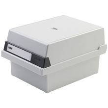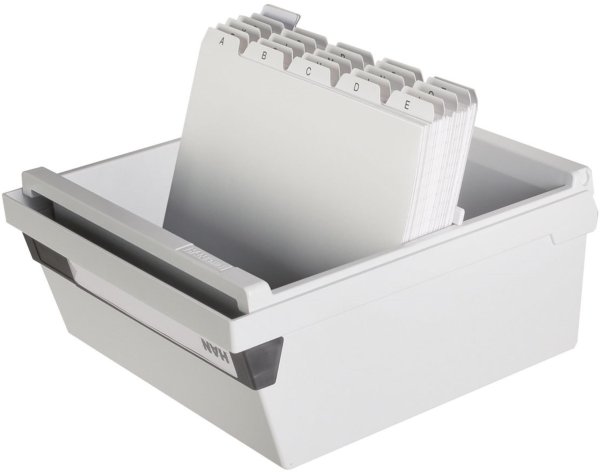 Kartotéka vyrobená z pevného plastu s gumovými nožičkami a odnímatelným víkem Formát A5 na šířku Rozměr 235 x 190 x 250 mm 1 dělicí deska Kapacita: pro 800 karet