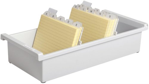 Kartotéka vyrobená z pevného plastu s gumovými nožičkami Bez víka Formát A6 na šířku Rozměr 171 x 76 x 346 mm Popis 2 dělicí desky, celkem pro 1 300 karet