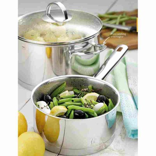 - materiál: nerezová ocel 18/10 - objem: 1,3 l- výška: 7,5 cm- průměr: 16 cm- síla stěny 0,8 mm- skleněná poklice- nerezové rukojetiLuxusní hrnce a pánve německé značky KELA, řady Cailin se zárukou 5 let jsou vyrobeny z leštěné nerezové oceli 18/10, mají vícevrstvé termoakumulační dno, sílu stěny 0,8 mm, skleněné poklice a nerezové rukojeti. Jsou vhodné pro všechny typy sporáků včetně indukčních.