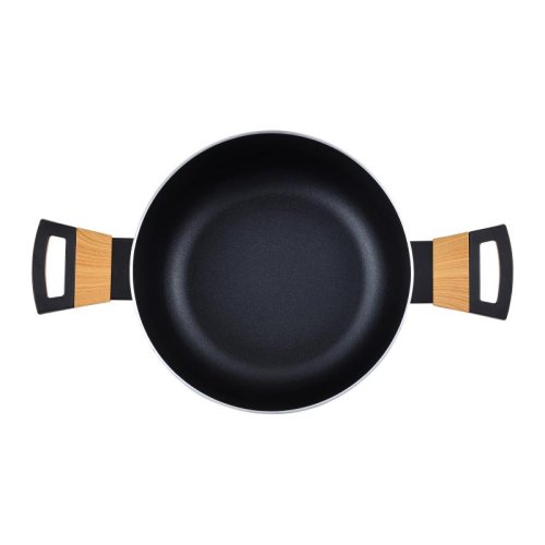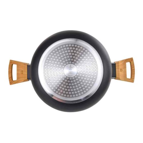 • Hrnec 24 cm se skleněnou poklicí. •Vyrobeno z lisovaného hliníku pro rychlý nárůst teploty.•ILAG Premium černý nepřilnavý povlak.•Indukce s voštinovými vložkami, vhodná pro všechny druhy tepla.•Žáruvzdorné dřevěné rukojeti Soft Touch.•Doporučujeme ruční čištění.Hrnec 24 cm se skleněnou poklicí z kolekce Bergner´s Earth Black je vyroben z lisovaného hliníku a zaručuje rychlý rozvod tepla. Prémiový nepřilnavý povlak ILAG je obzvláště odolný a vhodný pro každodenní použití. Vzhledem ke složení materiálu je při vaření v tomto kastrolu bez PFOA, olova nebo kadmia nutné použít pouze malé množství tuku, perfektní pro zdravé vaření. Ergonomická dřevěná rukojeť s měkkým úchopem a tepelně odolná proti popálení. Základna s indukčním bodem je vhodná pro všechny sporáky jako je indukční, plynový, sklokeramický, halogenový a elektrický. Snadno se čistí, na povrchu se nelepí potraviny a pro prodloužení životnosti výrobku se doporučuje ruční mytí.