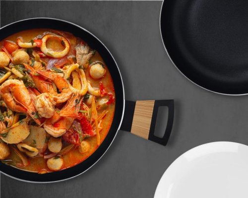 •28 cm hrnec se skleněnou poklicí. •Vyrobeno z lisovaného hliníku pro rychlý nárůst teploty.•Nepřilnavý povrch ILAG Premium v černé barvě.•Indukce s voštinovými vložkami, vhodná pro všechny druhy tepla.•Žáruvzdorné dřevěné rukojeti Soft Touch.•Doporučujeme ruční čištění.Hrnec 28 cm se skleněnou poklicí z kolekce Bergner´s Earth Black je vyroben z lisovaného hliníku a zaručuje rychlý rozvod tepla. Prémiový nepřilnavý povlak ILAG je obzvláště odolný a vhodný pro každodenní použití. Vzhledem ke složení materiálu je při vaření v tomto kastrolu bez PFOA, olova nebo kadmia nutné použít pouze malé množství tuku, perfektní pro zdravé vaření. Ergonomická dřevěná rukojeť s měkkým úchopem a tepelně odolná proti popálení. Základna s indukčním bodem je vhodná pro všechny sporáky jako je indukční, plynový, sklokeramický, halogenový a elektrický. Snadno se čistí, na povrchu se nelepí potraviny a pro prodloužení životnosti výrobku se doporučuje ruční mytí.